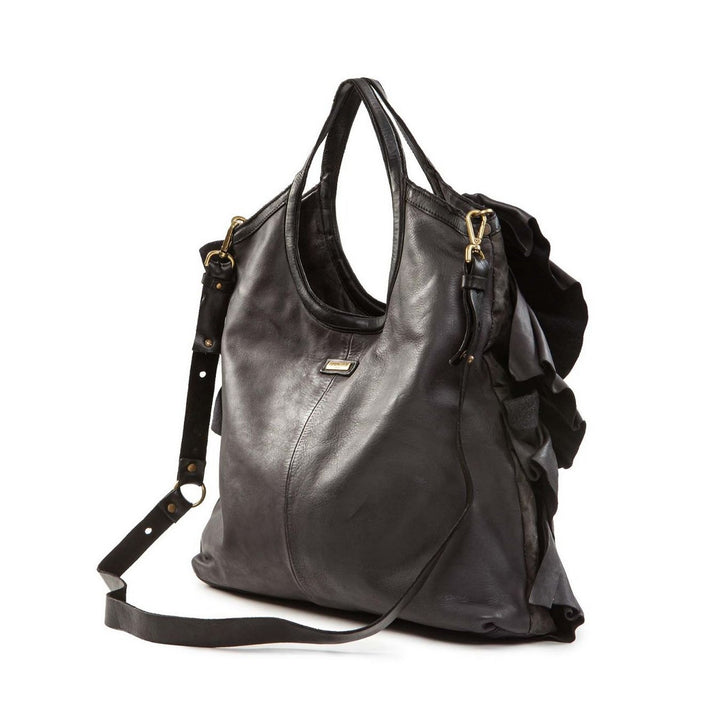 Eleganza artigianale e femminilità in una borsa di grande impatto visivo: la shopping Alice firmata Caterina Lucchi combina pelle di vitello, vacchetta e canvas tinta in capo, impreziosita da raffinate rouches lungo i lati per un effetto rigoglioso e sofisticato.