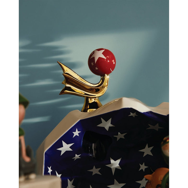 Firmata da Marcello Jori e Massimo Giacon, la stella cometa di Happy Eternity Baby è un oggetto decorativo in porcellana decorata a mano, pensato per completare la scena della Natività con un tocco di energia e creatività.