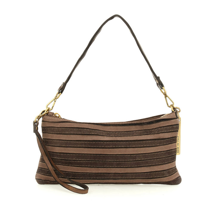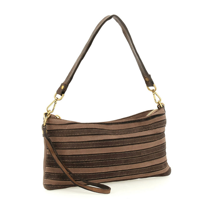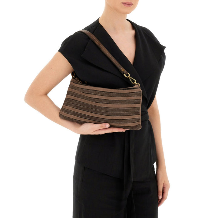 La borsa a spalla Nora è un accessorio elegante e distintivo, realizzato in una combinazione di pelle di vitello liscia, camoscio multiriga e vacchetta tinta in capo, per un effetto materico unico e sofisticato. Un equilibrio perfetto tra artigianalità italiana e stile contemporaneo.