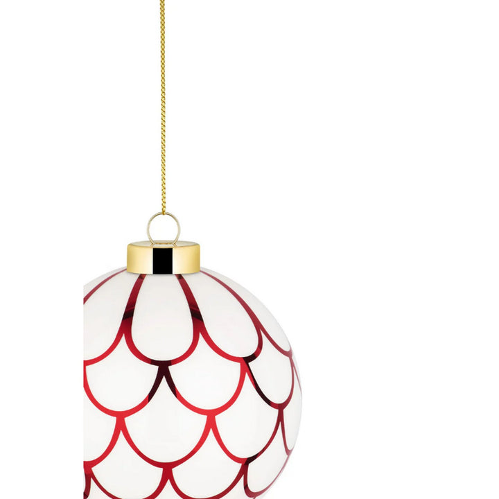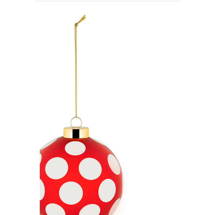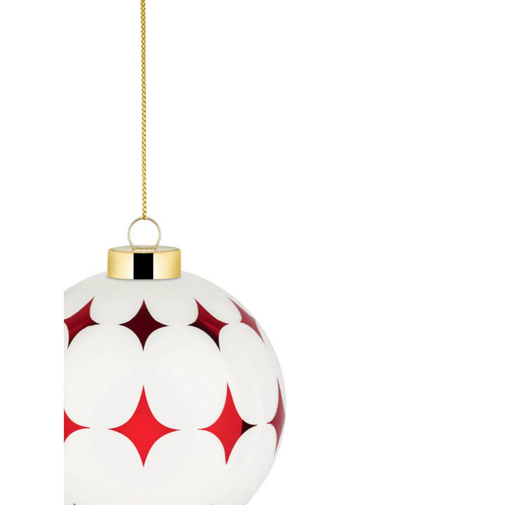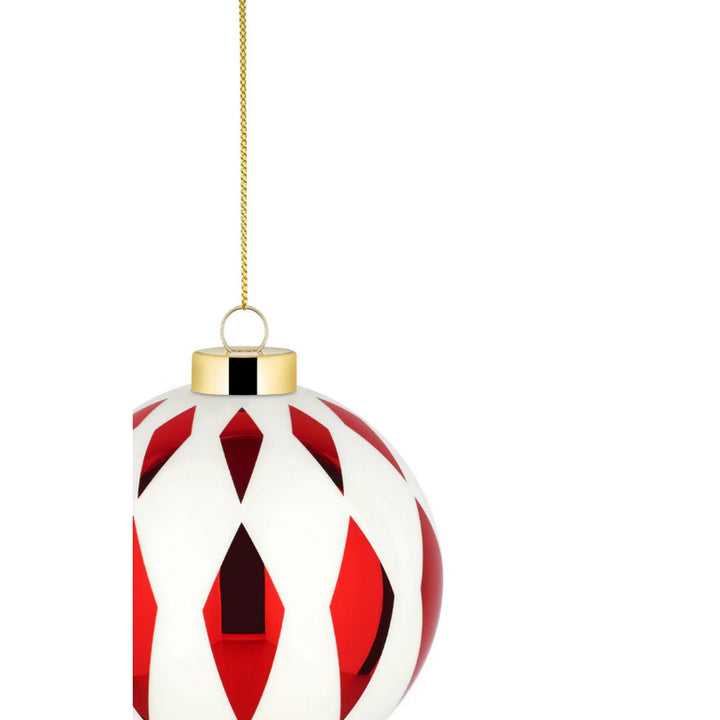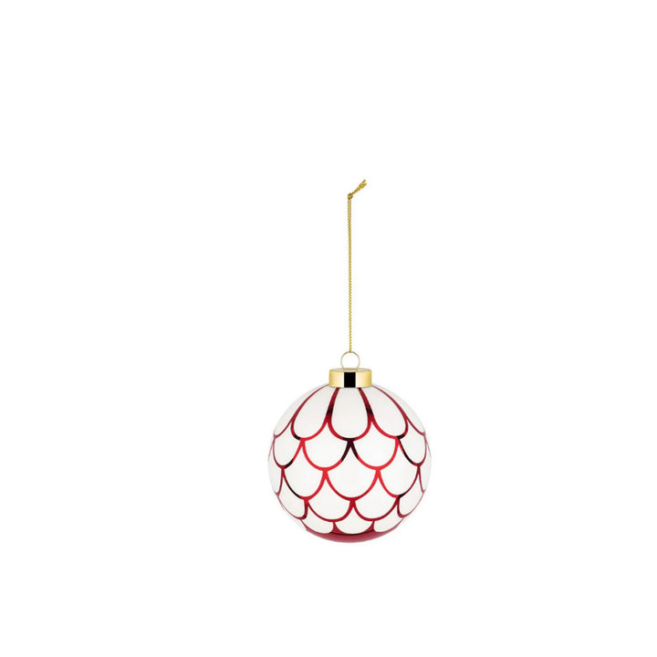 Realizzata in vetro soffiato, questa sfera da appendere si distingue per la lavorazione artigianale e il design distintivo, caratterizzato da righe, rombi o pois, declinati nei colori iconici del Natale: bianco, rosso e oro.