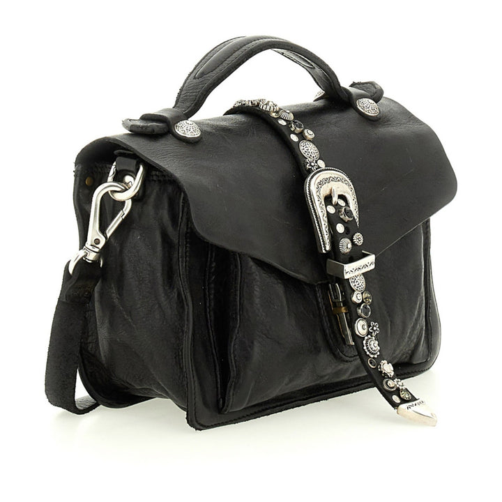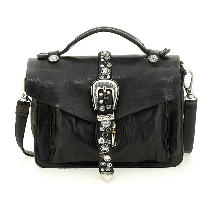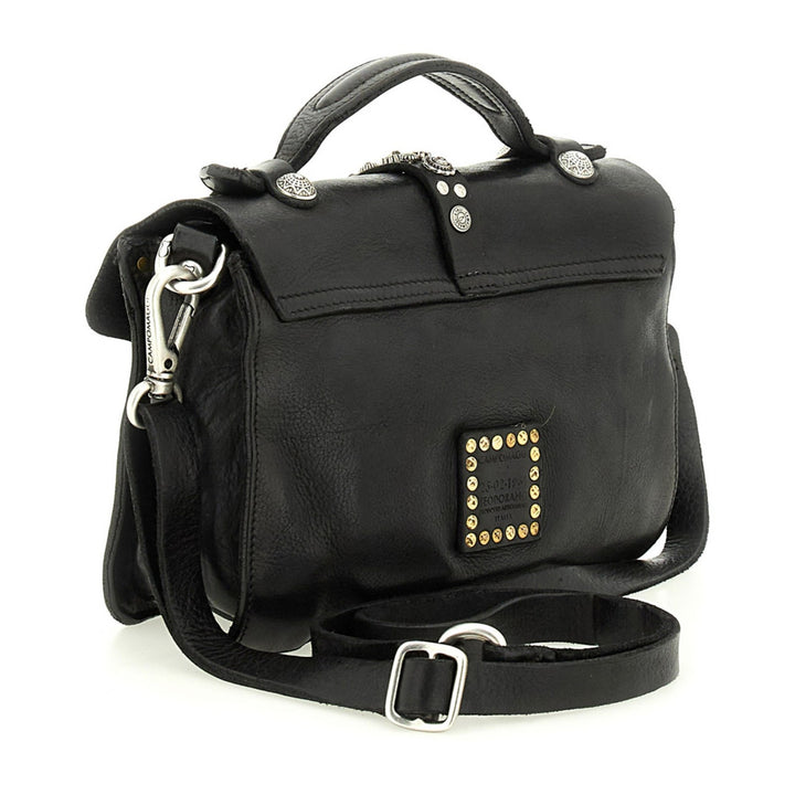 La borsa a tracolla Porzia di Campomaggi unisce la qualità della pelle di vacchetta tinta in capo alla brillantezza di borchie e strass, per un look grintoso, raffinato e 100% italiano. Ogni pezzo è unico, grazie alla tintura manuale che rende ogni borsa diversa e irripetibile.
